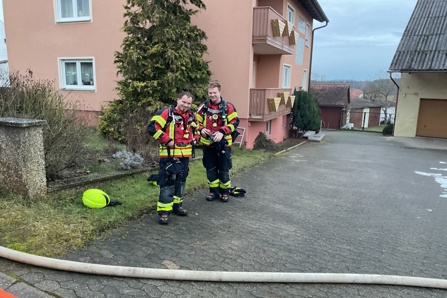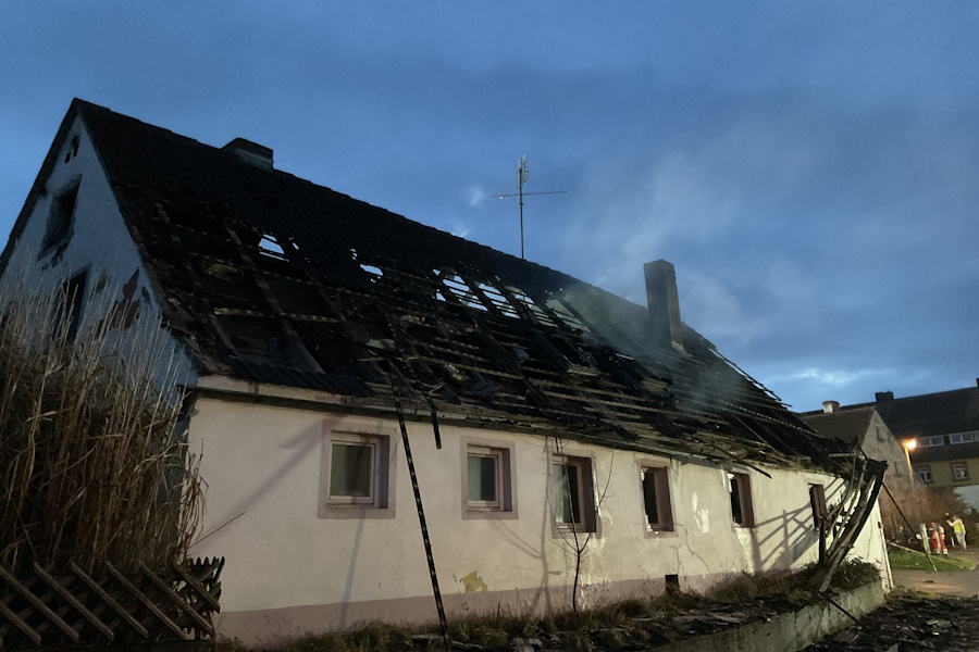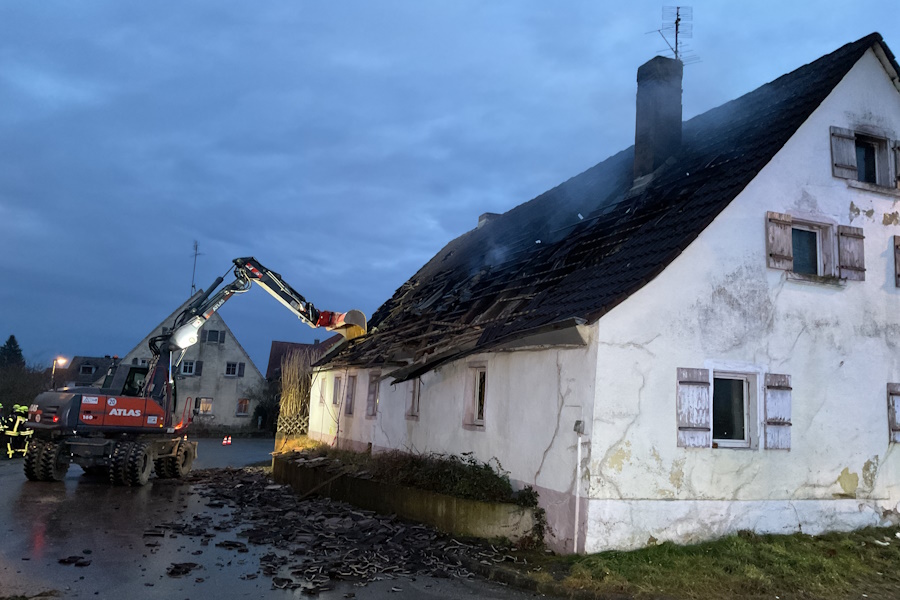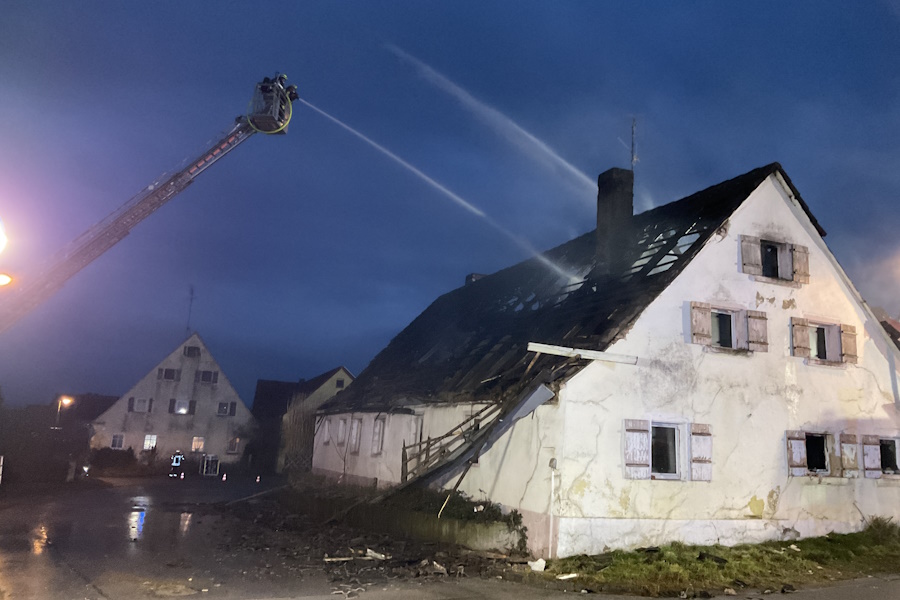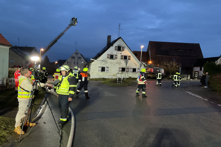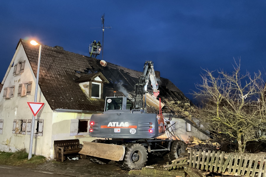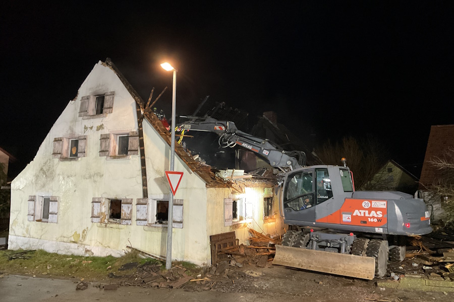 Zu einem Wohnhausbrand wurden wir zur Unterstützung mit der Drehleiter nach Thannhausen alarmiert. Beim Eintreffen der Wehren befand sich bereits ein Teil des Dachstuhles und das Erdgeschoss in Vollbrand. Mit mehreren Trupps unter Atemschutz sowie mit der Drehleiter konnte ein Übergreifen der Flammen auf die Nebengebäude vermieden werden. Da das Gebäude stark einsturzgefährdet war, war ein Betreten des Hauses nicht mehr möglich. Der Bewohner war zum Glück nicht zu Hause. Aus zwei Zisternen konnte über lange Schlauchstrecken ausreichend Wasser zur Einsatzstelle gebracht werden. Somit hat die im Jahr 2025 neu gebaute Zisterne ihre erste Bewährungsprobe bestanden. Auch der Wasserversorger wurde alarmiert, der durch Öffnen eines Schiebers mehr Wasser zur Einsatzstelle bringen konnte. Als Problem stellten sich die Glutnester im sogenannten Fehlboden des Gebäudes heraus, da hier durch die noch vorhanden Dachziegel kein Löschen möglich war. Durch die Einsatzleitung wurde entschieden, einen Bagger zur Einsatzstelle zu bringen, dieser konnte die Dachziegel sowie die Balken entfernen und somit ein Löschen ermöglichen. Es waren mehrere umliegenden Feuerwehren mit im Einsatz, diese wurden über unser Führungsfahrzeug koordiniert. Vom Roten Kreuz wurden wir mit Brotzeit, kalten und warmen Getränken versorgt. Auch der Bürgermeister der Gemeinde Pfofeld, Reinhold Huber, machte sich ein Bild von der Lage und bedankte sich bei allen Wehren für ihr schnelles und professionelles Eingreifen.